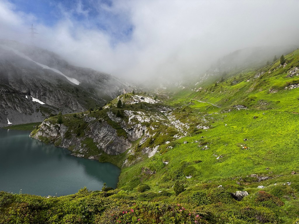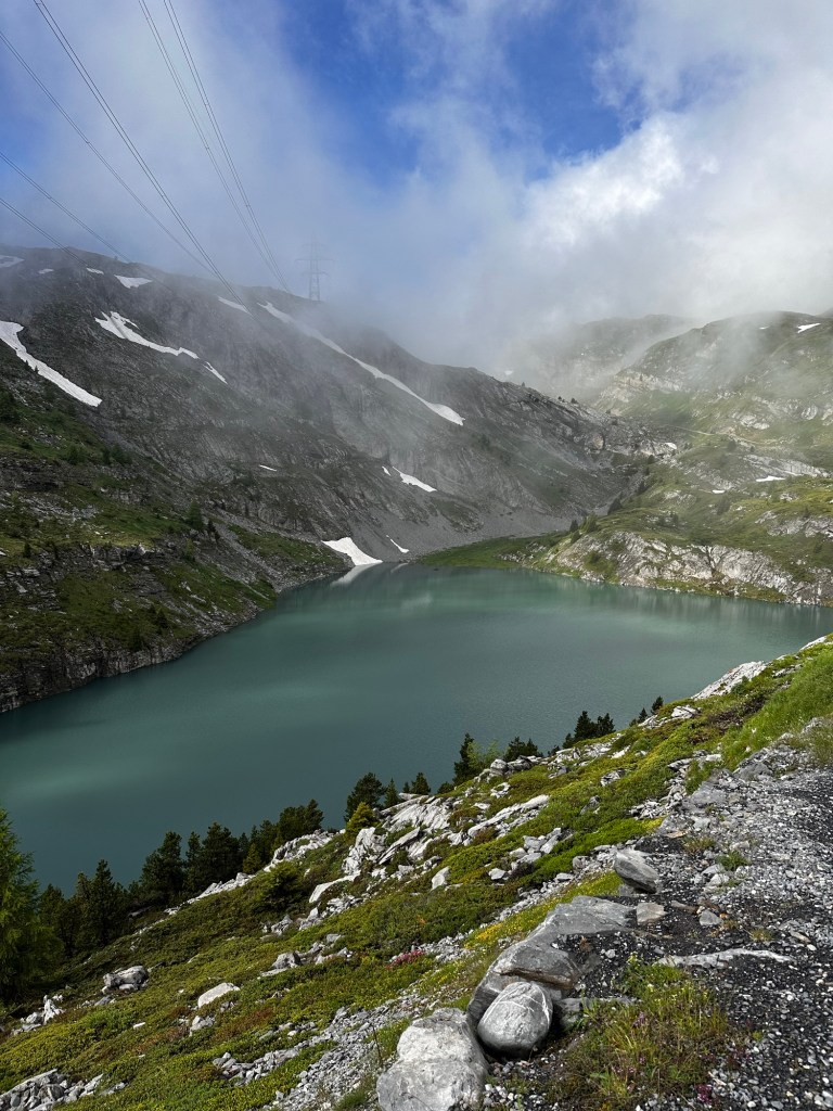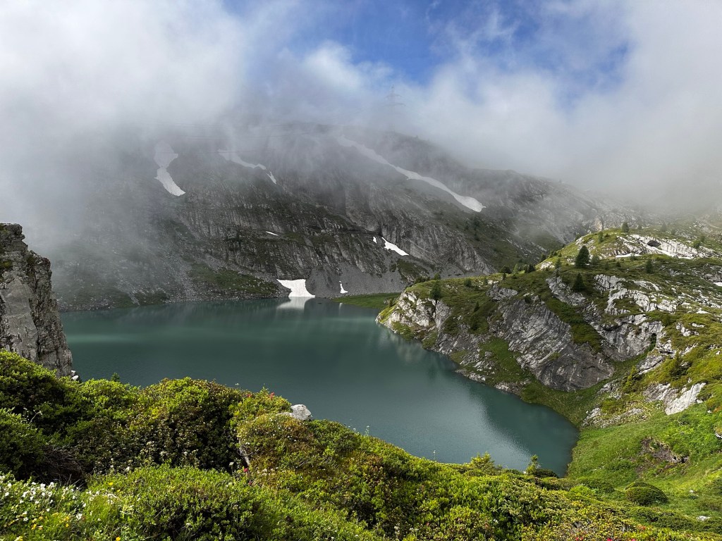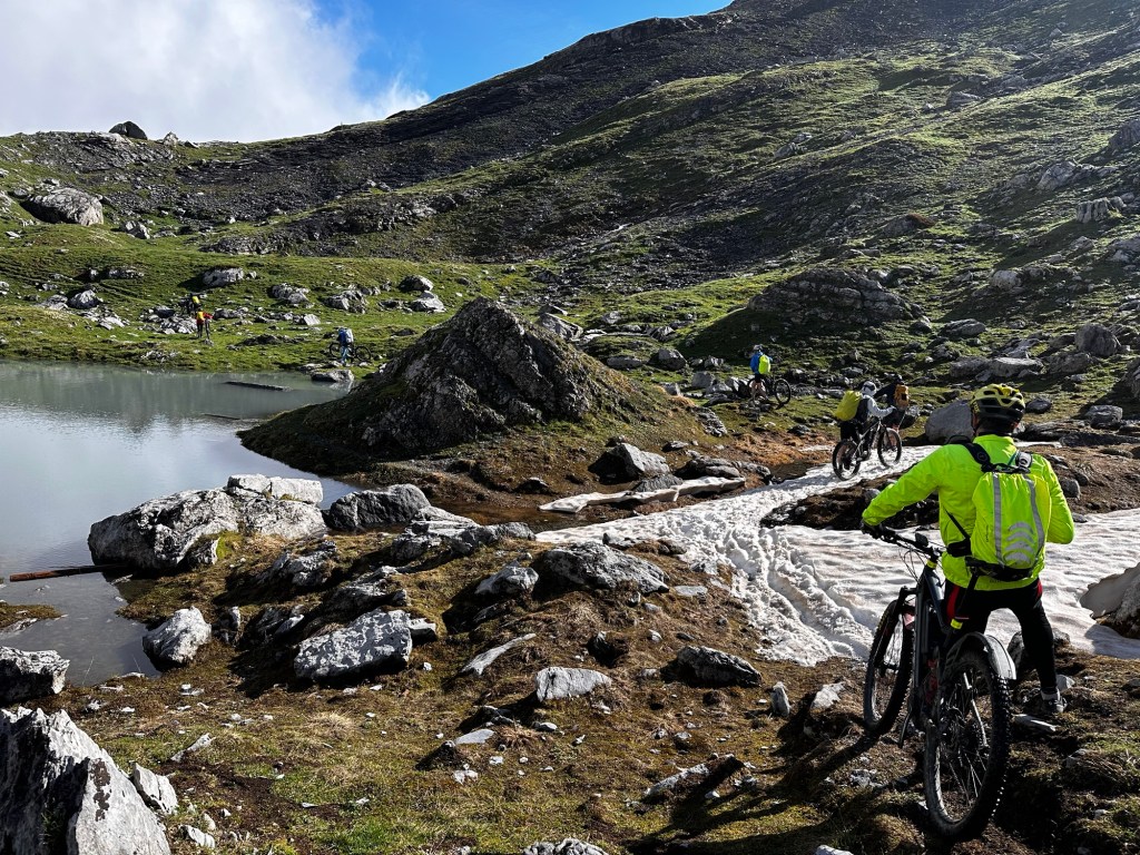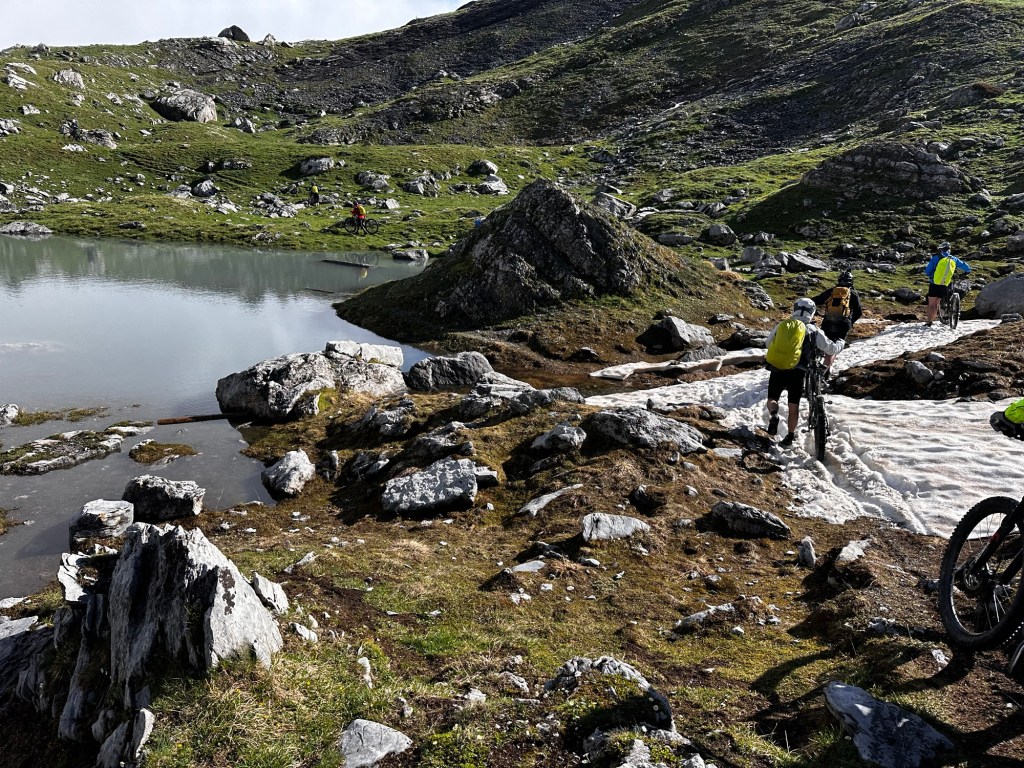 Nous attaquons par une descente de 1000- démarrage avec un mur de neige et un lac magnifique