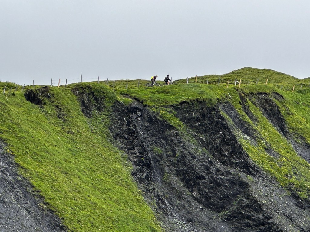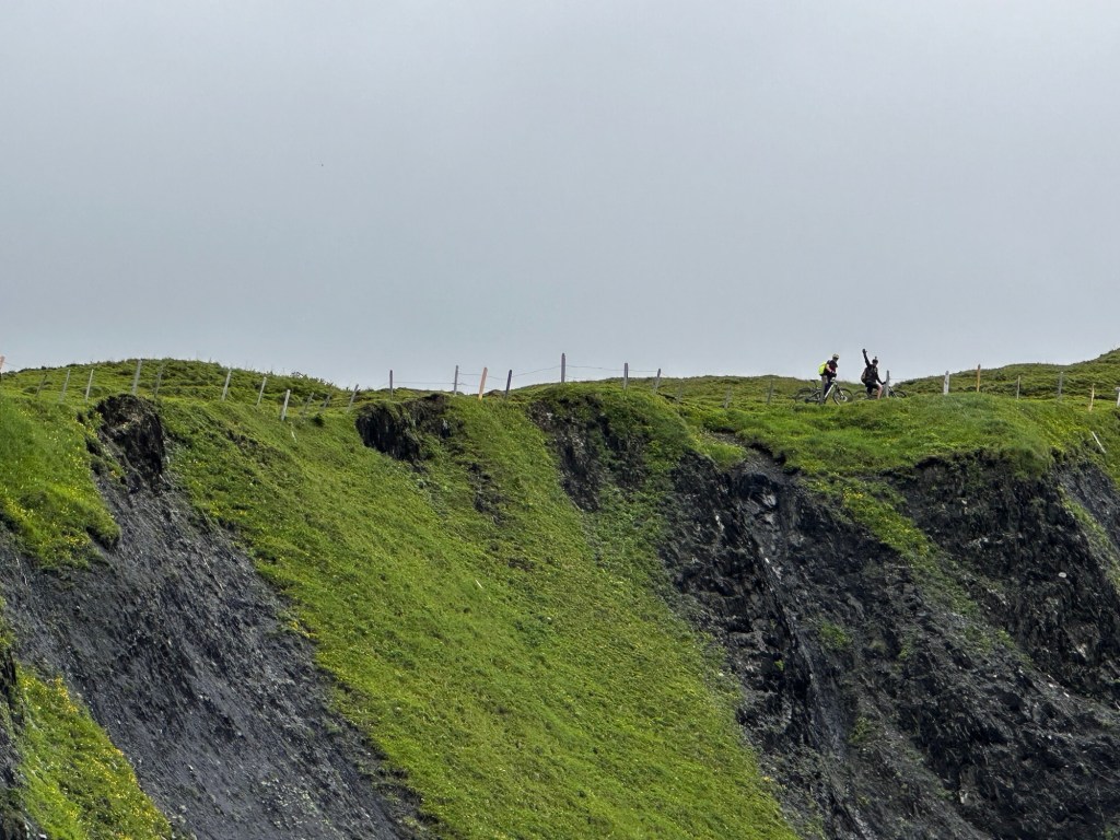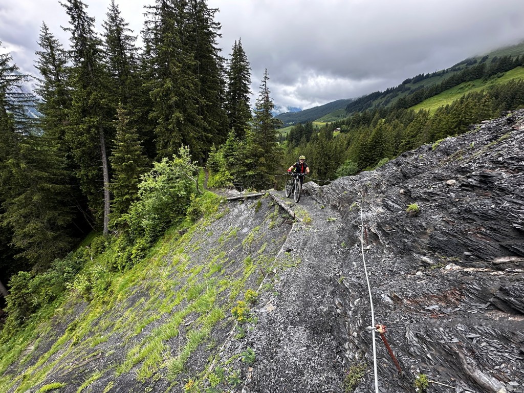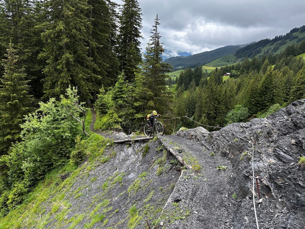 Après une réunion au sommet la veille et une mutinerie au sujet de la trace, il était prévu une étape roulante le cul sur la selle sans poussage sans portage…..3 traces sont prévues certains choisissent la trace de Roland (Roland) les autres la trace à Lilian (les autres) Rémi fidèle à lui même prend un troisième sens !!Après un départ tranquille sur les chemins forestiers tout se passe pour le mieux du monde; tout le monde a le sourire même les fille; une météo nuageuse et des paysages magnifiques; les éclaireurs François et Gérald sont partis devant pour nous donner les indications